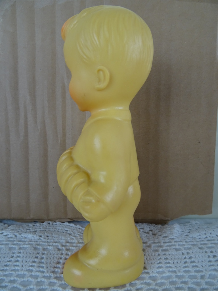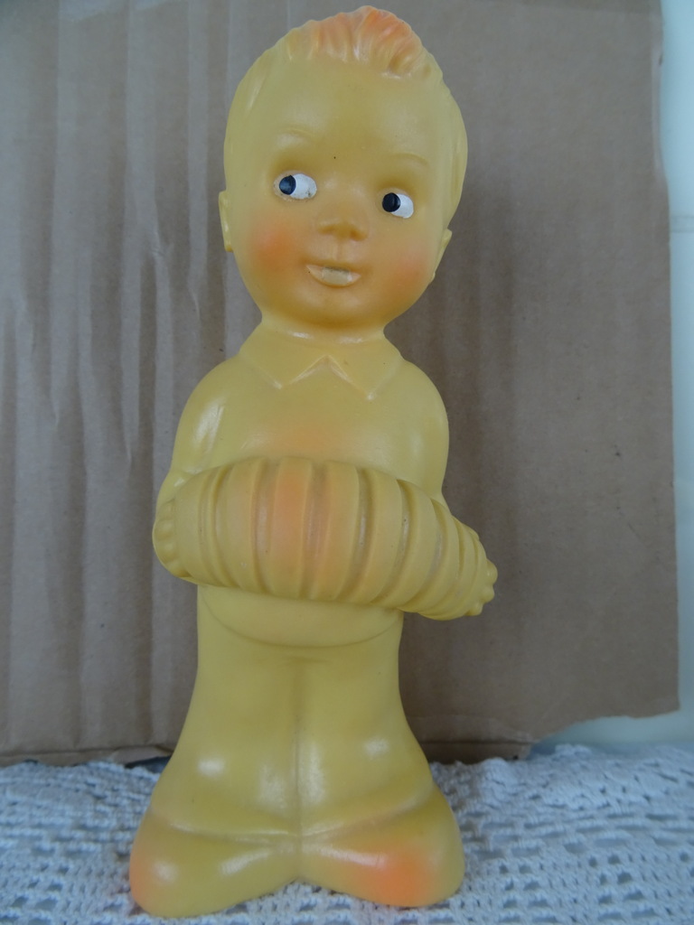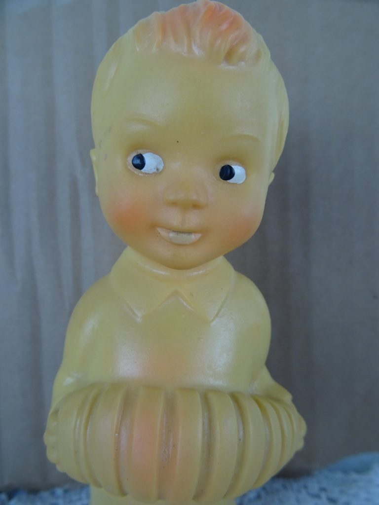 Vintage Italiaans knijppopje vervaardigd rond 1960 of iets later. Afgebeeld is een vrolijk jongetje met een trekharmonica. Het popje is in een prachtige gebruikte staat en werkt nog perfect , zie foto’s. Het is gemerkt; 183 Brev. Made in Italy.