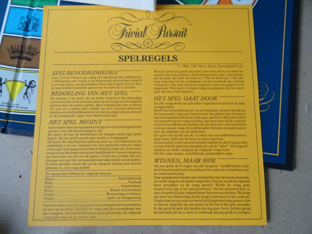 Vintage spel Trivial Pursuit Genus tweede editie uit 1987. Met dit vraag en antwoord spel krijg je makkelijk een avond om. Het is te spelen door 2 tot 36 (!) spelers. In prachtige gebruikte staat, zie foto’s. Compleet met alle stukjes en dobbelstenen. Alle kaarten zijn ongekreukt. Beschrijving spel; Elke speler start met een leeg rondje. Het rondje moet tijdens het spel met 6 verschillende kleuren gevuld worden. Dit kan door door vragen te beantwoorden in 6 verschillende categorieën. De categorieën zijn aardrijkskunde, entertainment, geschiedenis, kunst en cultuur, wetenschap en natuur en sport. Om partjes voor je rondje te verdienen rol je met een dobbelsteen. Elke kleur hoort bij een categorie. De speler die als eerst het rondje vol heeft en in het midden van het spel eindigt heeft gewonnen.